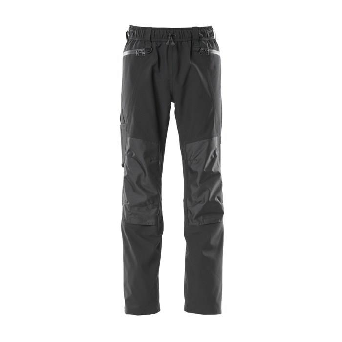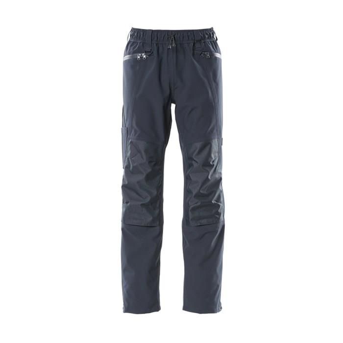 Åndbar, vind- og vandtæt med tapede sømme. Ergonomisk formede bukseben er konstrueret efter kroppens naturlige bevægelser. D-ring til nøgler eller ID-kort. Lynlåsåbning foran i begge sider, så hængelommer, fra bukser indenunder, kan trækkes igennem. Knælommer kan reguleres, så knæpuder er placeret optimalt i forhold til dine knæ. Samcertificeret til brug med MASCOT knæpudetype SHORT eller LONG, da knæpudelommen kan højdejusteres. Ekstra lang lynlås med vindfang på ydersiden af benene til nem brug uden over støvler.